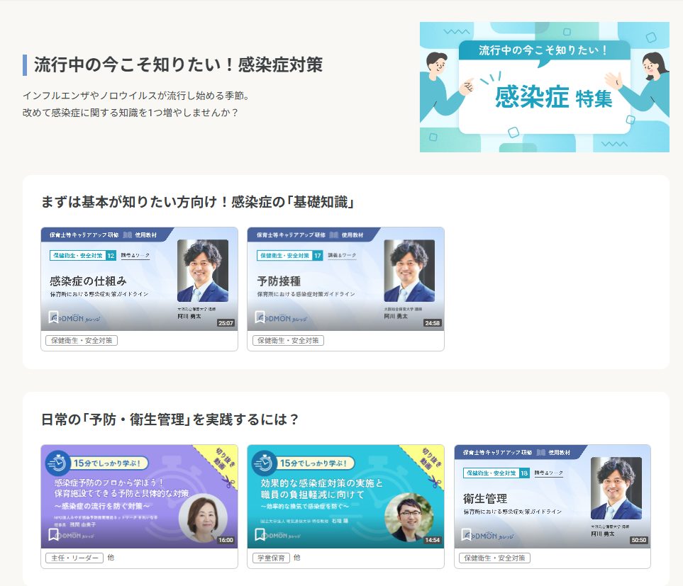 そこで、保育現場ですぐに役立つ「感染症対策」に関する研修動画をまとめた特集ページをご用意しました。