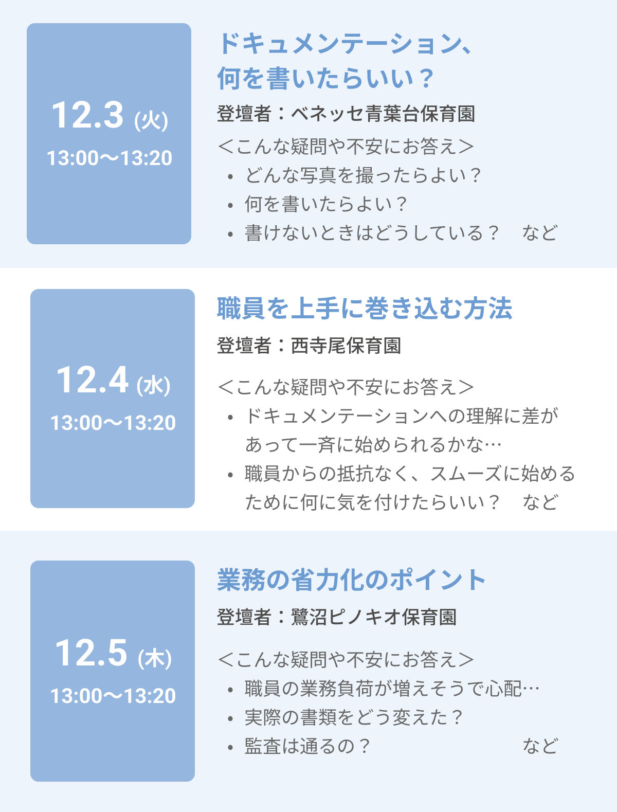 今回はその始めたい「けど」にフォーカスして、実際にドキュメンテーションを導入した施設さまのリアルな声を聞ける3日間のイベントを開催します。
