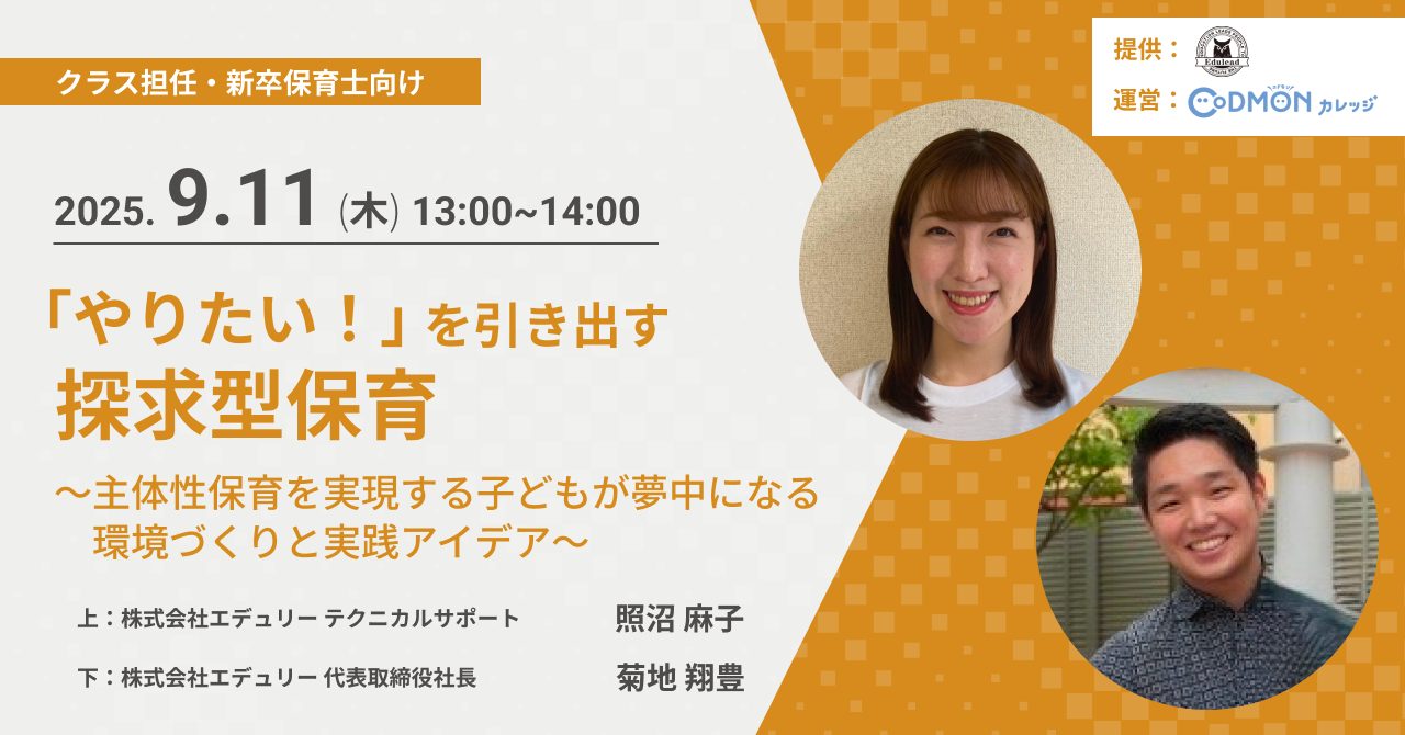 株式会社コドモンは、保育者が子どもと向き合うための時間と心のゆとりを創出すべく、保育所におけるICTの活用支援を行ってまいりました。保育業界の課題解決に向けた新たな取組として、保育者の専門性向上における支援事業を開始しております。全国の保育者に対し学びや気づきの機会の提供を推進してまいります。